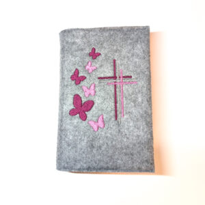 Gotteslobhülle, Filz, grau, mit Schmetterlingen und 3 Kreuzen