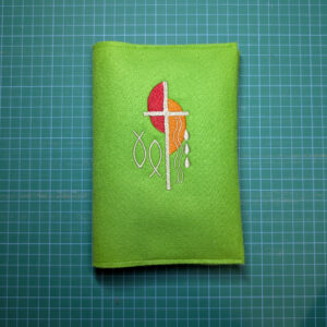 Gotteslobhülle, Filz, grau, bestickt mit einem grauen Kreuz, roten und orangen Halbkreisen, Fischen, Wellen und Tropfen