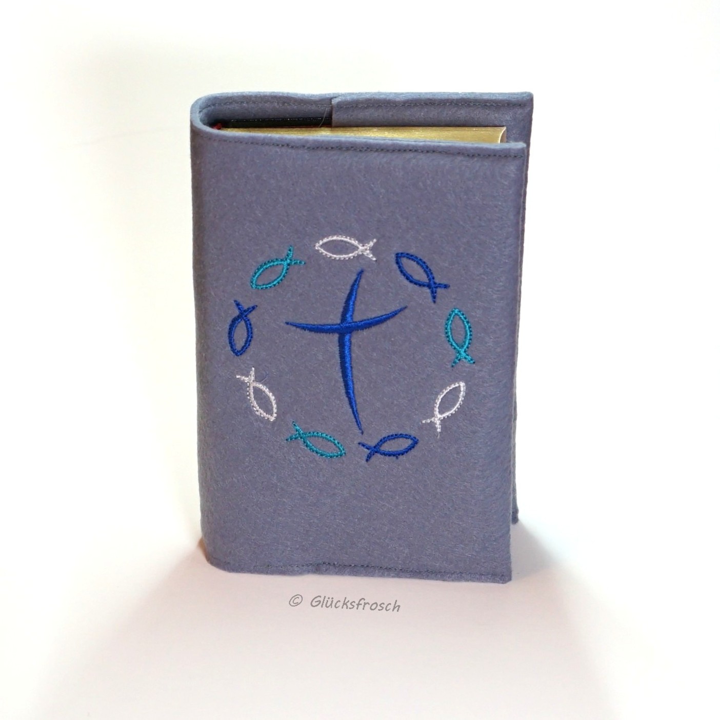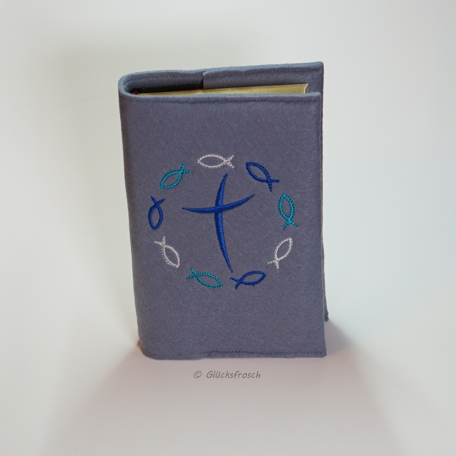 Gotteslobhülle, Filz, hellgrau, bestickt mit blauem Kreuz und Fischen