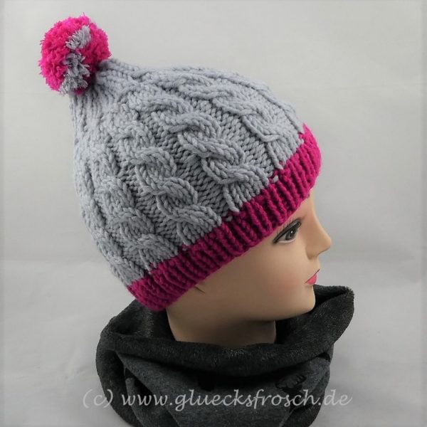 Handgestrickte Bommelmütze mit Zopfmuster.