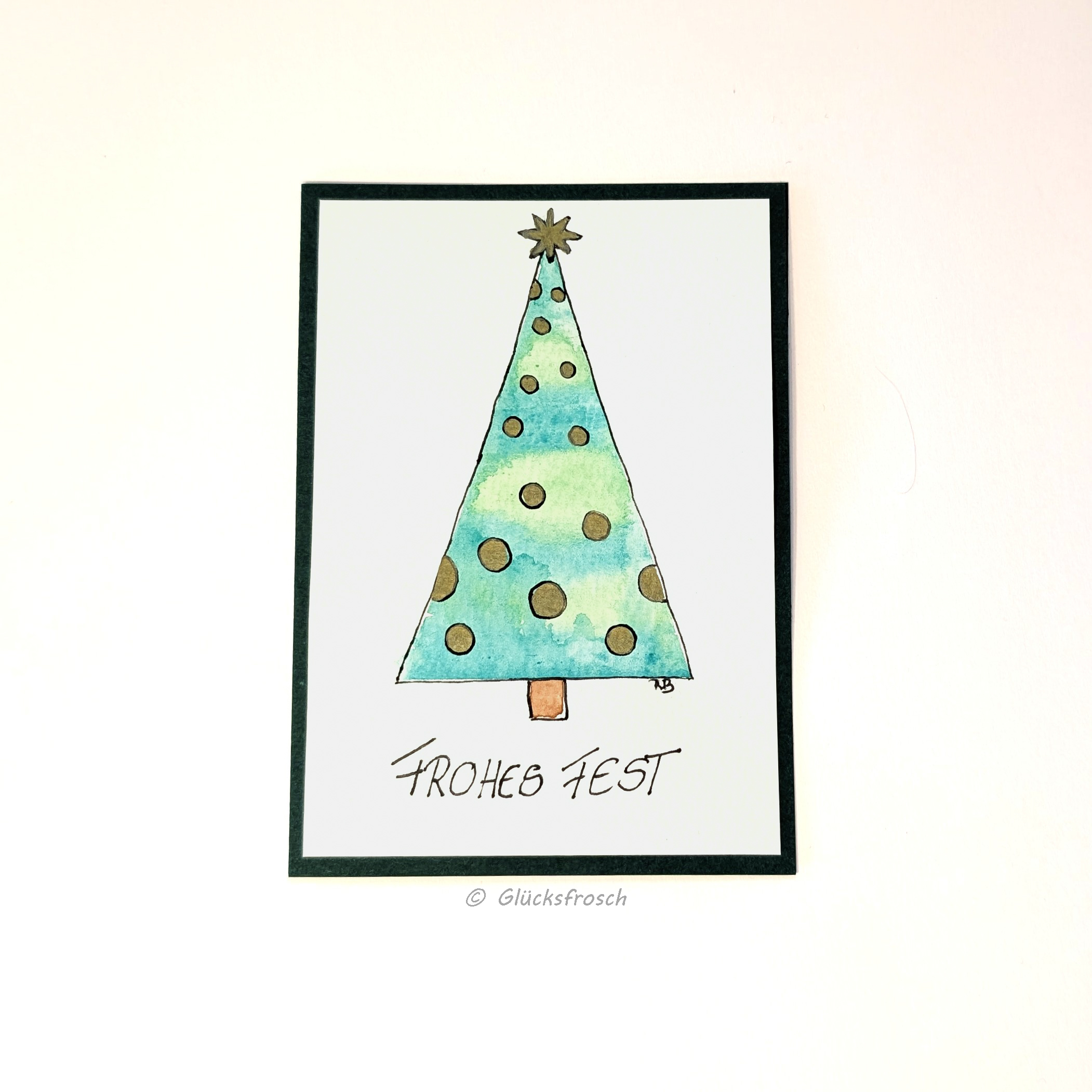 Wunderschöne grüne Weihnachtskarte, die mit einem handgemalten Weihnachtsbaum dekoriert ist. Der Weihnachtsbaum ist mit Aquarellfarben auf Aquarellpapier gezeichnet, die Kugeln mit einem Filzstift und mit Frohes Fest beschriftet. Das Logo ist nur ein Wasserzeichen und auf der Karten nicht sichtbar.  – perfekt, um festliche Grüße stilvoll zu übermitteln.