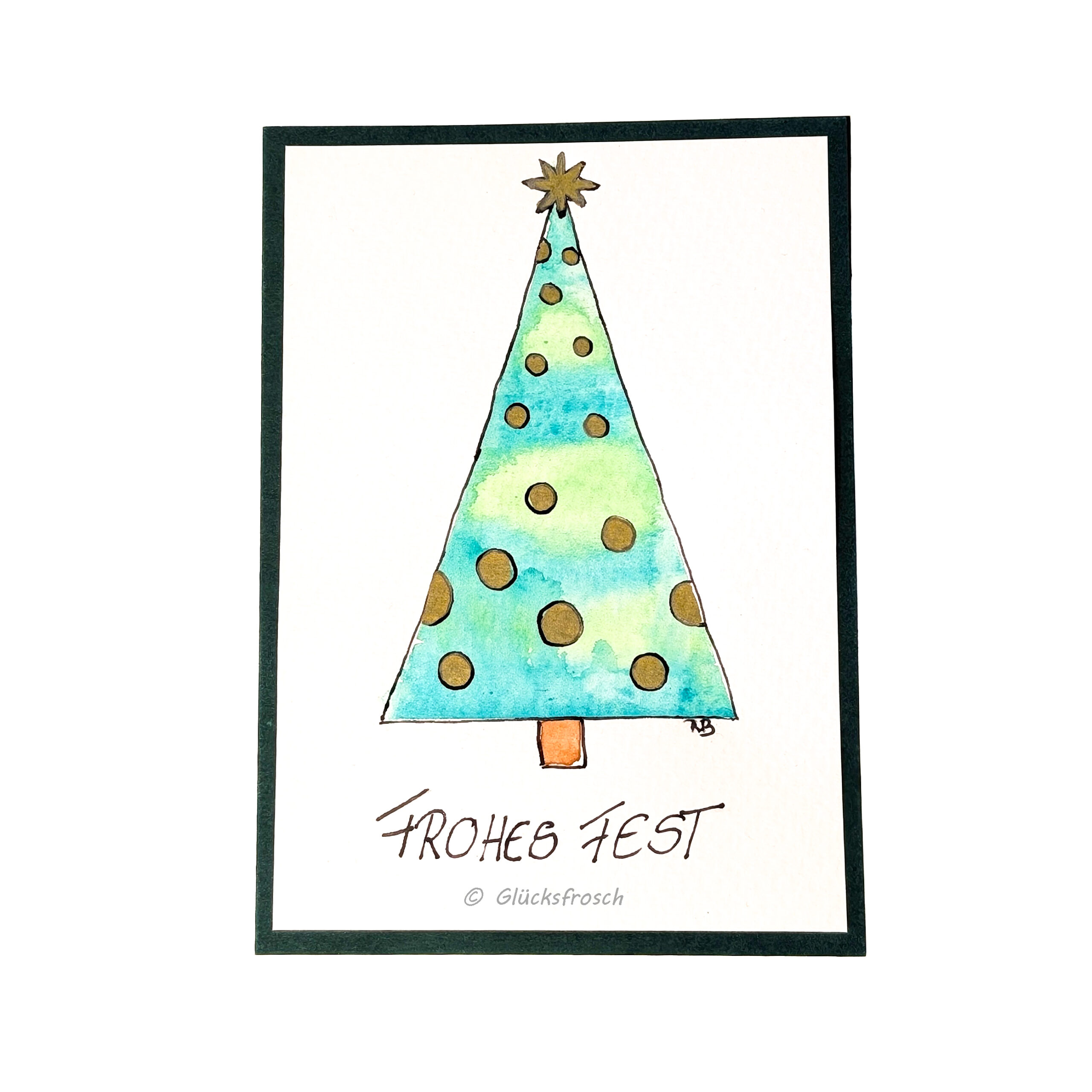 Wunderschöne grüne Weihnachtskarte, die mit einem handgemalten Weihnachtsbaum dekoriert ist. Der Weihnachtsbaum ist mit Aquarellfarben auf Aquarellpapier gezeichnet, die Kugeln mit einem Filzstift und mit Frohes Fest beschriftet. Das Logo ist nur ein Wasserzeichen und auf der Karten nicht sichtbar. – perfekt, um festliche Grüße stilvoll zu übermitteln.