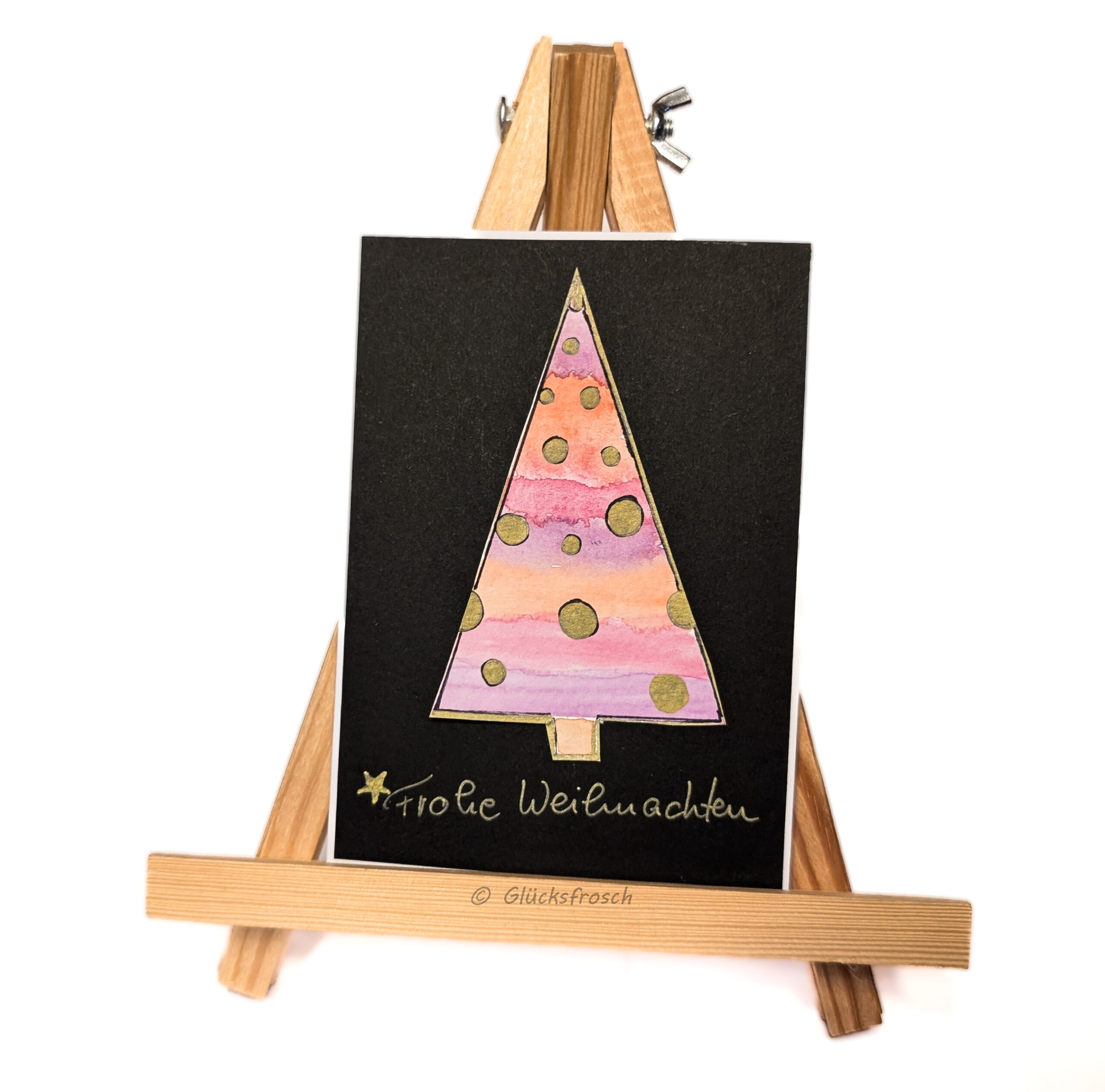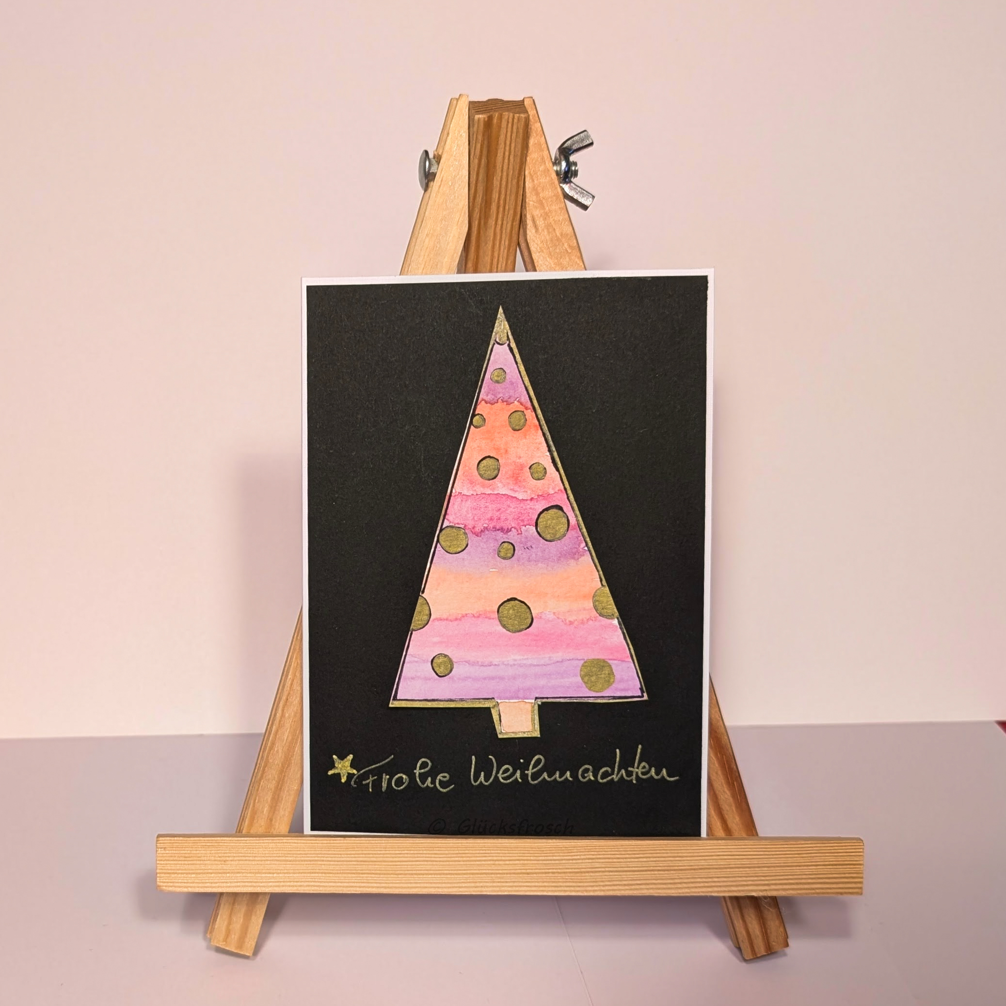 Wunderschöne Weihnachtskarte mit handgemaltem Aquarell. Rosa Weihnachtsbaum ist auf schwarzes Tonpapier geklebt, die Karte ist weiß